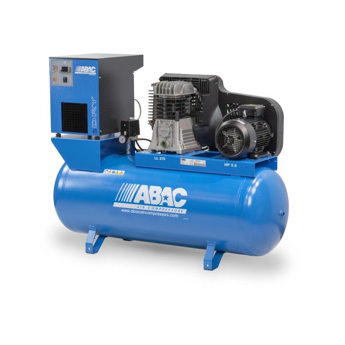 L'ABAC PRO B5900B/270 FT5,5 FFO est un compresseur compact à deux pistons équipé d'un sécheur d'air. Il est conçu pour un usage intensif dans des applications industrielles exigeantes. Équipé d'un moteur d'une puissance de 5,5 CV (4 kW), d'un sécheur frigorifique ABAC DRY45 et d'une capacité d'aspiration de 653 l/min, ce modèle est idéal pour alimenter des outils pneumatiques et des machines de production. Grâce à une pression de travail maximale de 11 bar et à un réservoir de 270 litres, le compresseur assure un fonctionnement stable et durable, sans nécessiter de démarrages fréquents. Ce modèle est un excellent choix pour l'industrie agroalimentaire (transformation des légumes et des fruits), l'agriculture, l'industrie automobile et les ateliers.